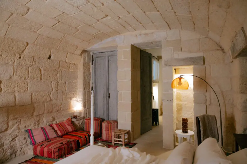 Empireo Riad propone una collezione di suite finemente progettate, ciascuna intitolata a figure del mito e della poesia — Medusa, Enea, Beatrice, Omero, Ulisse, Caronte, Virgilio e Paolo e Francesca. Questi ambienti uniscono l’architettura in pietra locale a delicate illuminazioni e decorazioni artistiche, dando vita ad atmosfere che evocano al tempo stesso comfort e racconto.