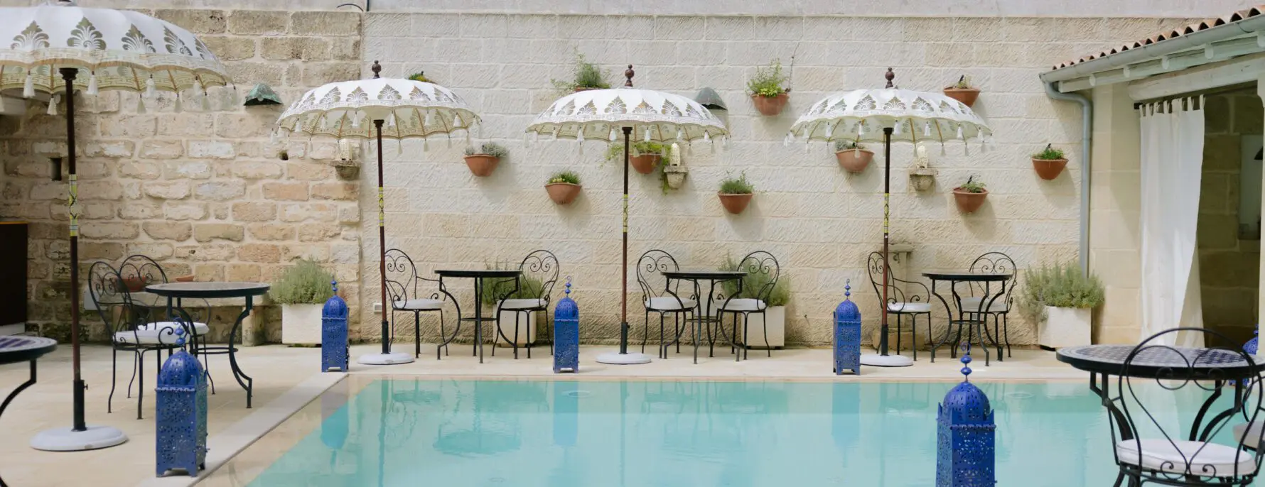 All’interno della corte si apre la piscina con cascata, incorniciata da tende bianche e dettagli orientali.