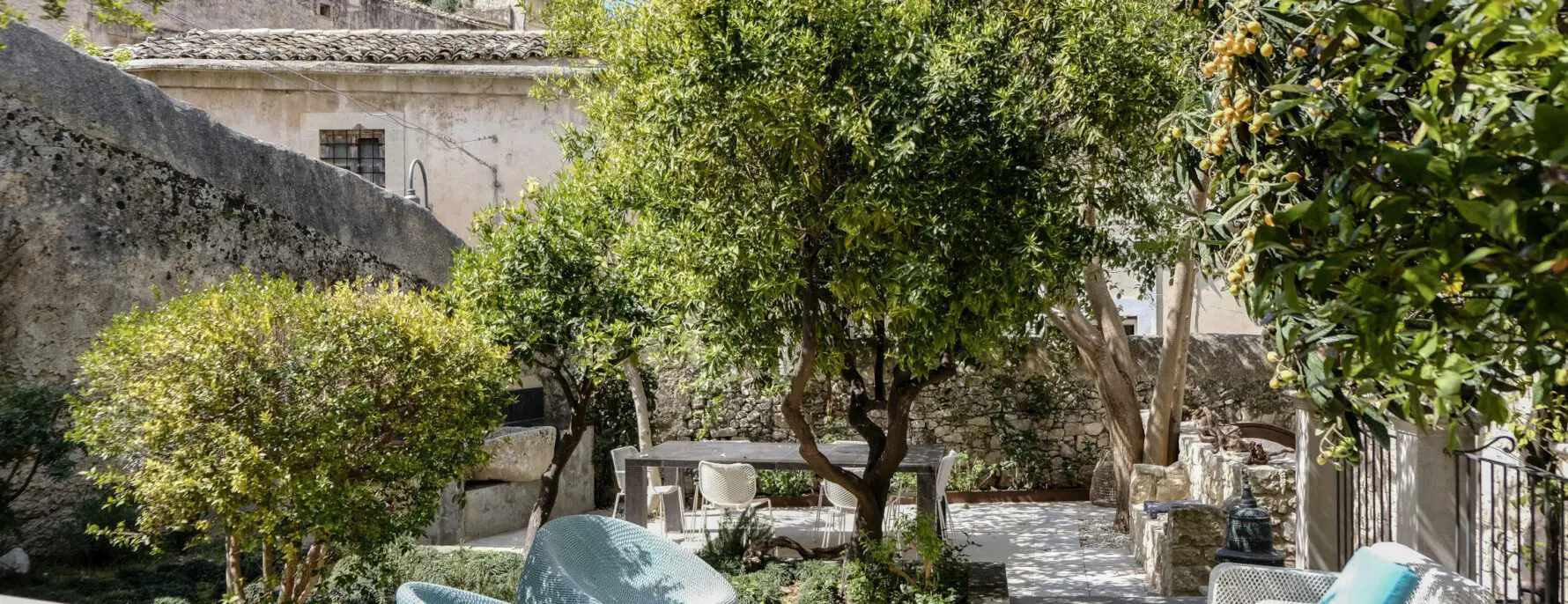 Il giardino e la terrazza, con vista sul Duomo di San Giorgio, sono spazi meditativi in cui godere del silenzio e ritrovare il contatto con la terra. Protetti da alti muri, potrete rilassarvi nella vasca idromassaggio in pietra, prenotare un massaggio sotto l’albero di melograno, cenare o leggere all’ombra di alberi di agrumi, in una dimensione che fonde il silenzio dell’hortus conclusus dei monasteri con le armonie segrete dei giardini arabi.