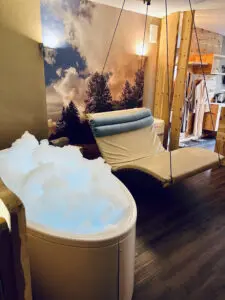 La nostra suite, un vero NIDO con la jacuzzi pronta ad accoglierci e una particolarissima chaise long a dondolo sospesa pronta a cullarci dopo l’idromassaggio. Una vera chicca!