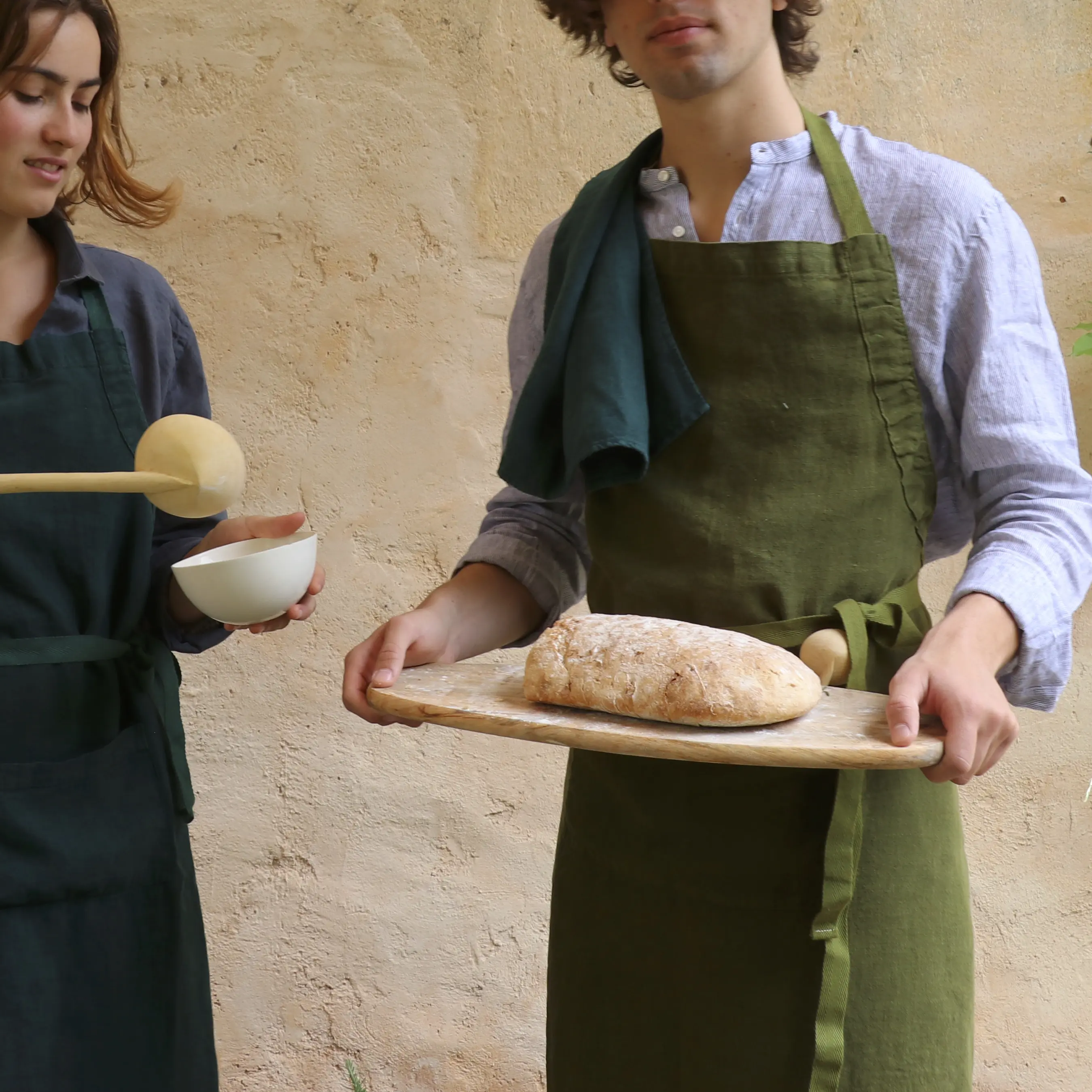 Sontuosi e morbidi al tatto, i grembiuli di Once Milano, fatti a mano e realizzati in 100% lino italiano, sono disponibili in una varietà di colori: dai toni audaci come il giallo a quelli più neutri.