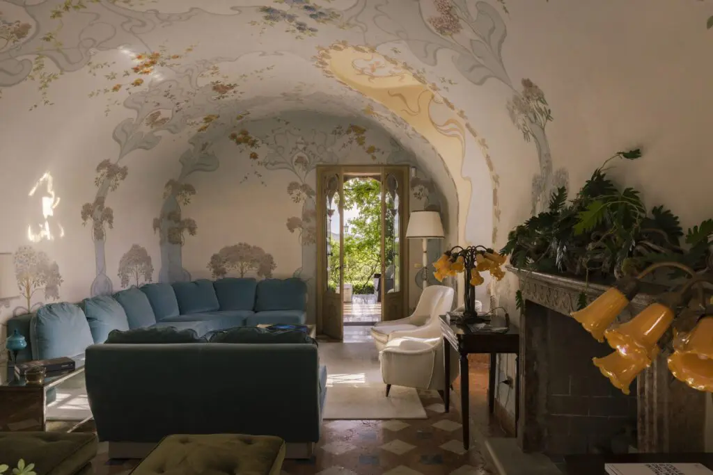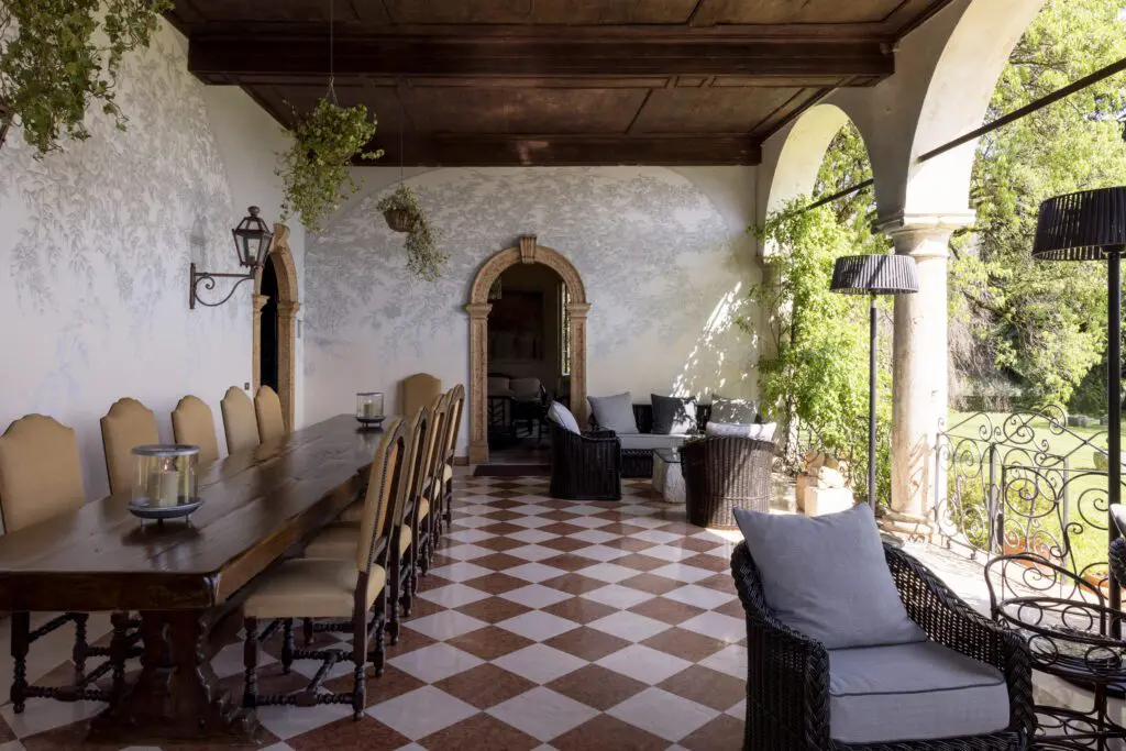 La villa stessa è stata restaurata con sensibilità e carattere. Affreschi originali decorano le pareti dei saloni al piano terra, che si aprono su una veranda panoramica con viste mozzafiato sulla valle. Gli interni sono raffinati ma accoglienti, con luci soffuse, materiali classici e una disposizione che invita tanto alla convivialità quanto alla contemplazione. Al piano superiore, quattro suite matrimoniali offrono comfort e privacy, mentre l’atmosfera che pervade la casa riflette l’autenticità di un luogo che non ha mai avuto bisogno di dimostrare nulla — soltanto di essere scoperto.