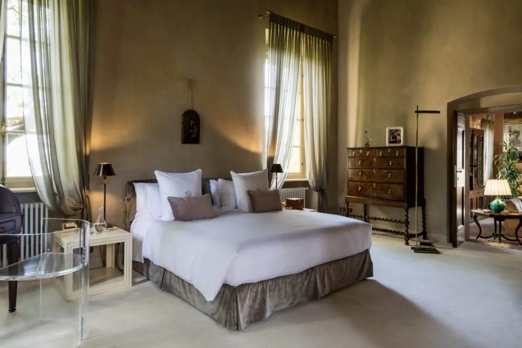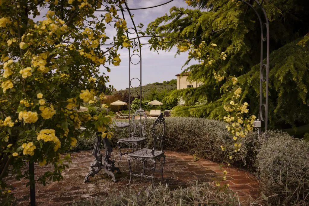 All’esterno, la tenuta si apre in un parco privato dove silenzio e spazio sono i veri lussi. Una piscina panoramica, circondata da ulivi e fiori, offre sollievo durante le giornate calde, mentre una vasca idromassaggio e un putting green regalano ulteriori occasioni per godere del ritmo dolce della vita qui. Passeggiando nei giardini, ci si imbatte in un antico cipresso che si ritiene sia stato piantato ai tempi dei viaggi di Colombo — un monumento vivente al trascorrere del tempo.
