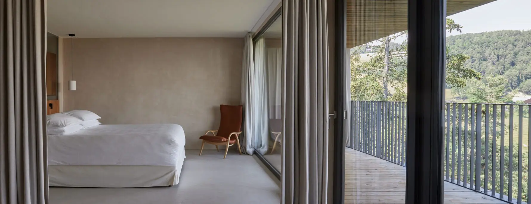Opened in 2019, Hotel Saltus harmoniously integrates into its natural surroundings through minimalist architecture and the use of local materials. The façade is crafted from larch wood, while interiors feature clay and lime walls, limestone flooring, and porphyry stone from the site’s excavation. These elements create a seamless connection between the hotel and the forest landscape.