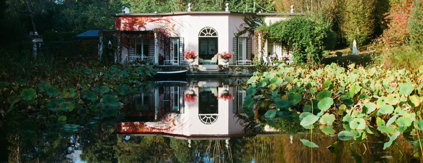 The villa has two bedrooms, one in a Prussian green and one pink, with two grand, momentous bathrooms. The one in mottled black marble even contains a small sky of stars. The living room, surrounded by niches and neoclassical vases, overlooks the patio and the lake shore, and is perfect for summer evenings, winter mornings, aperitifs and dinners. The large veranda, surrounded by flowers and plants, is a wonderful dining room from which to admire nature, birds feeding in the surrounding trees and ducks swimming across the lake.