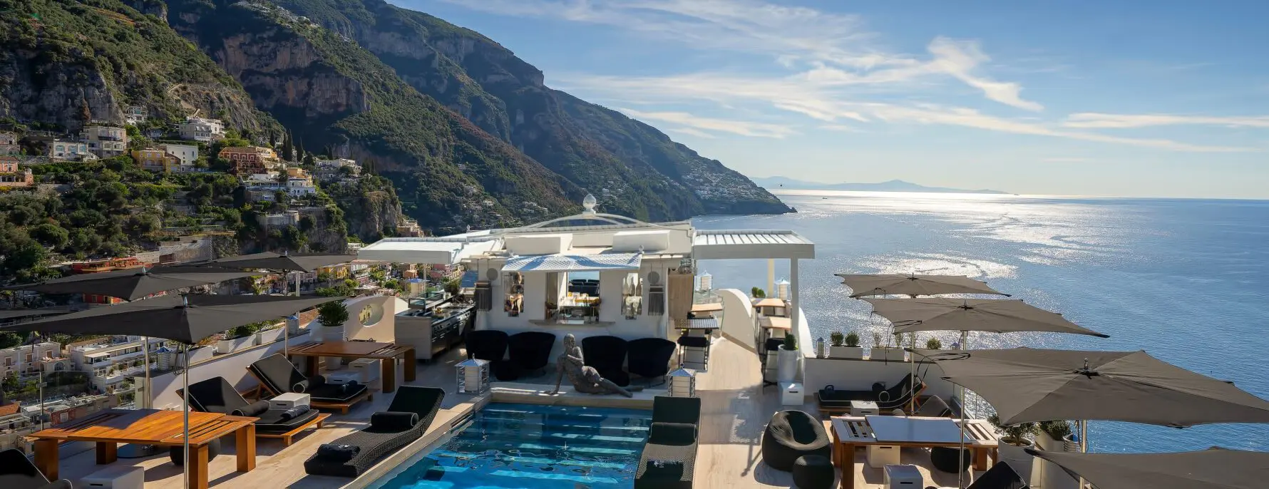 HVF Villa Franca, located in a prime position, in the most panoramic point of Positano, encloses all the charm of the Amalfi Coast. From the exclusive rooftop terrace, unique with a breathtaking 360° view of the entire coast and the typical colorful houses, you get lost between the blue of the sky and the sparkling of the Mediterranean Sea, giving the sensation of being suspended and immersed in the landscape. A few steps away from the center and two enchanting beaches, this boutique hotel surprises with its interiors, a refined union of art and design. An atmosphere of tranquility envelops this corner of paradise, where the enchanting beauty of the coast dominates the panorama and the scents of bougainvillea and citrus fruits inebriate the air.