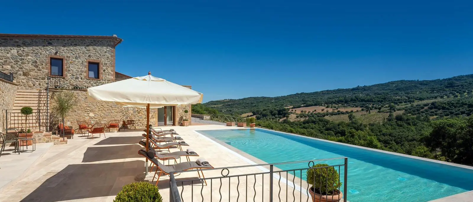 Nestled amidst approximately 15 acres (70,000 sqm) of pristine countryside, Villa Monte Mario is a newly built 700 sqm (7,500 sq ft) residence distinguished by world-class facilities and seamless harmony with its surroundings. Its location near Montalcino places guests within easy reach of some of Tuscany’s most iconic landscapes and cultural destinations — roughly 50 km south of Siena, 30 km east of Grosseto, and about two hours’ drive from both Florence and Rome.