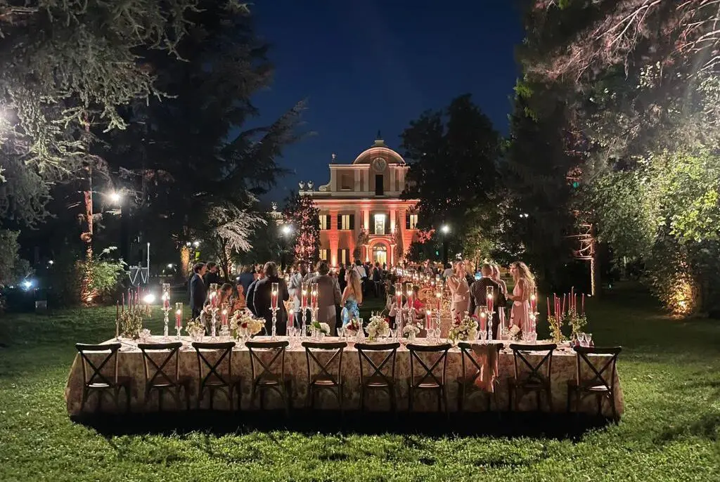 Inside, the ground‑floor halls feature coffered ceilings, Venetian‑style floors, and Murano glass chandeliers, hosting up to 160 guests. The first floor offers luminous frescoed rooms accessed via a grand marble staircase, suitable for civil ceremonies, gala dinners, or DJ sets for up to 240 guests. With its centuries‑old park as a natural backdrop, Villa Zarri is ideal for weddings, corporate events, private parties, and concerts, accommodating up to 350 attendees.