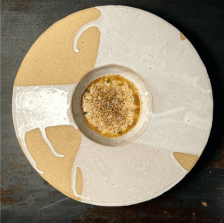 This is followed by a dish dedicated to beetroot, cooked in her land and cast with ginger butter, accompanied by an almond cream and a fresh beetroot and plum broth. A medlar granita completes the dish.