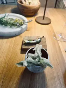 Then, a combination of opulence and acidity, with a herbs tempura (sage and pineapple), with grilled okra (okra), robiola and a plum sambal.