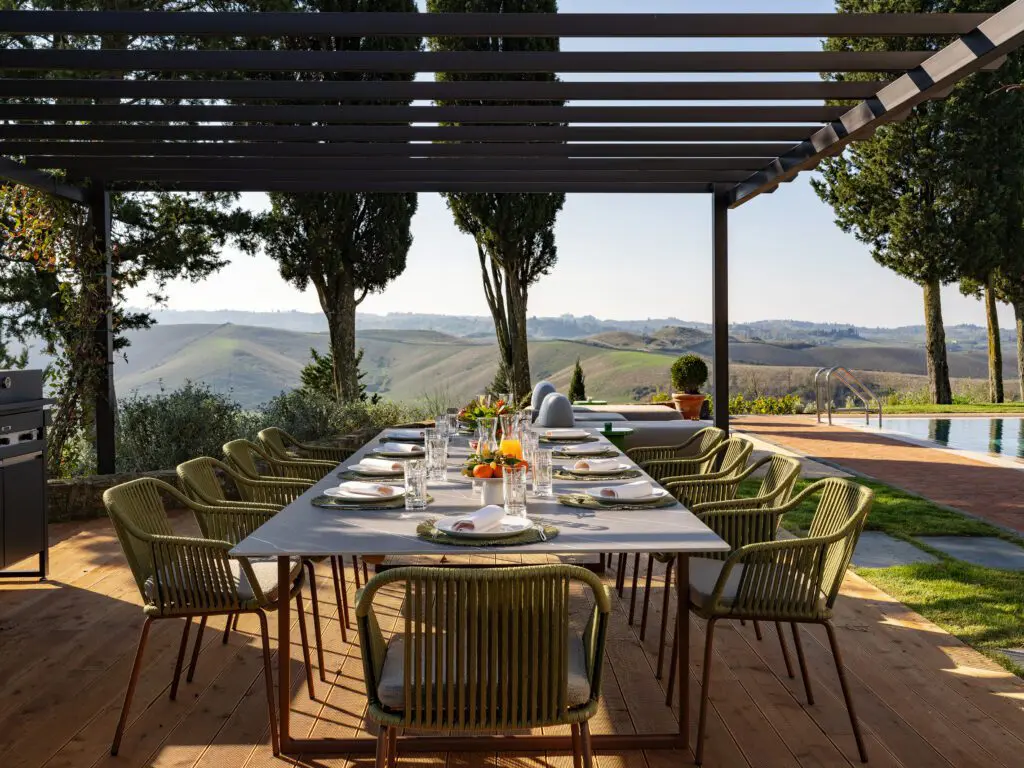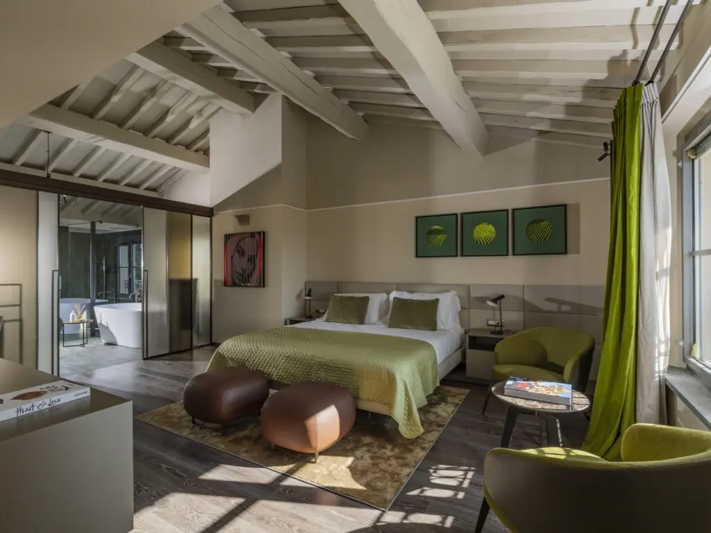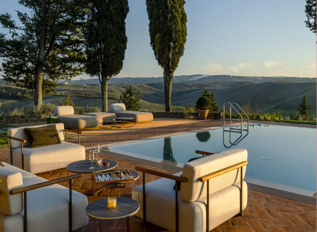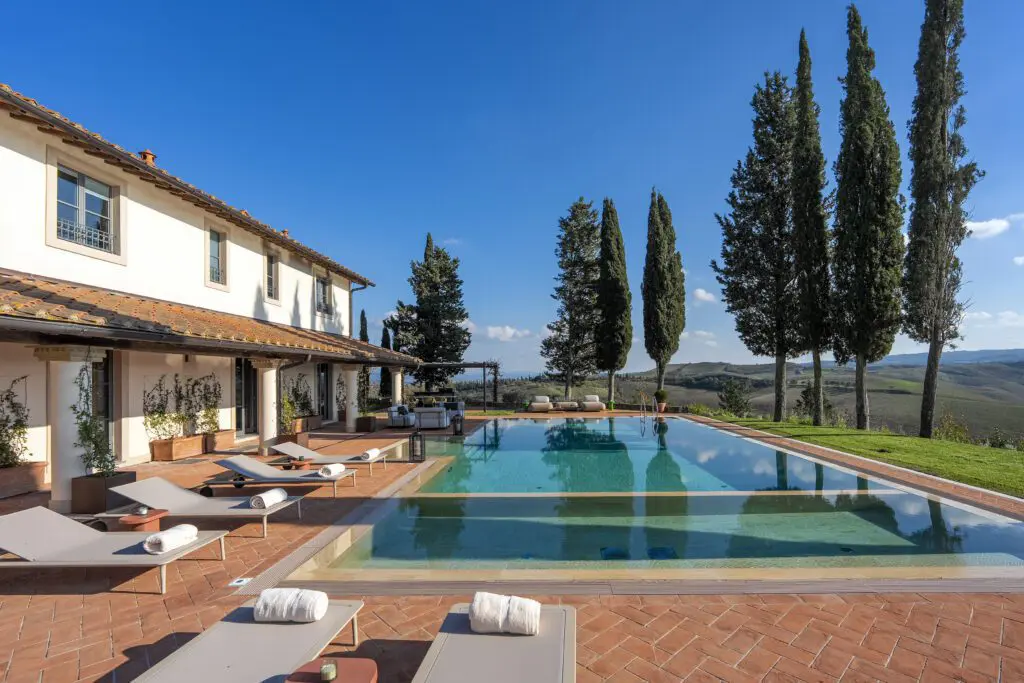 Set within approximately 15 acres of countryside near Montalcino, the villa covers 700 square meters and accommodates seven beautifully appointed bedrooms and suites. Each room features king- and queen-size beds, air-conditioning, rainforest showers, Smart TVs, and curated artworks, creating an environment of understated elegance and relaxation.