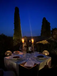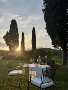 In the evening we were guests of La Limonaia, the small kitchen where Laura and “Mami” (mother) helps her with the preparations and cook celebrating the tuscan cuisine. Before dinner we enjoyed an aperitif with a splendid view over the Tuscan hills.
